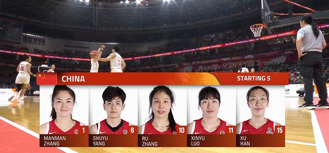 中国女篮首发为:中锋韩旭,前锋罗欣棫、张茹,后卫杨舒予、张曼曼。——中国队变阵,让张茹出战增加防守强度。
